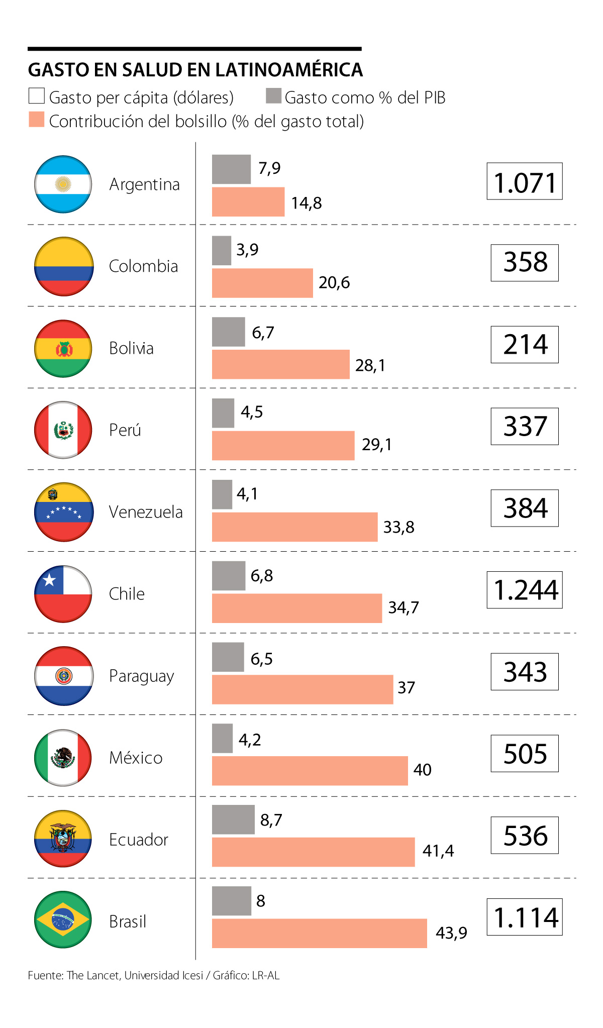 En el ranking de los que más gastan está Ecuador liderando, con 8,7% del PIB; seguido por Brasil, con 8%; Argentina, con 7,9%; Chile, con 6,8%; Paraguay, con 6,5%; Perú, con 4,5%; México, con 4,3%; y nuevamente, hasta el gasto de Venezuela sería más alto, ya que se destina, de acuerdo con el informe, 4,1% del PIB en salud. El gasto colombiano, incluso, está por debajo del promedio mundial: 4% del PIB.