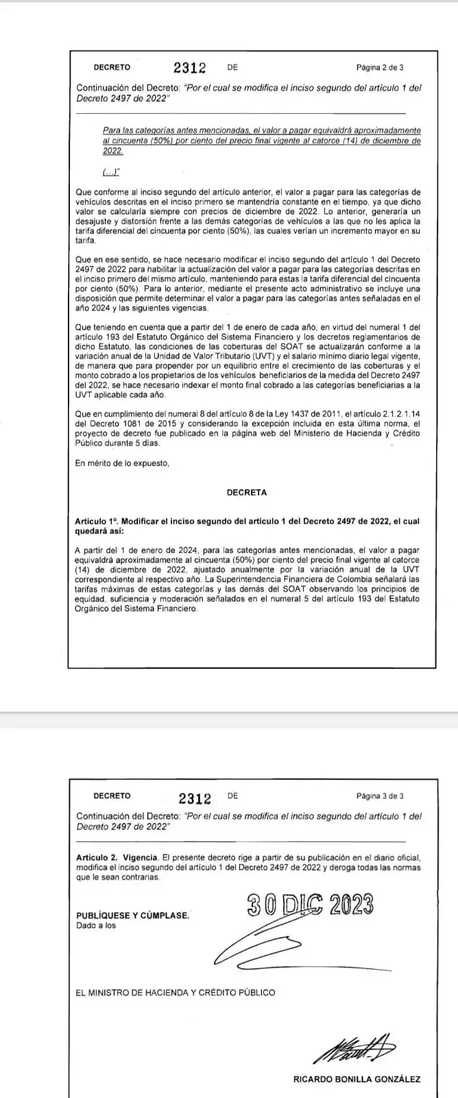 "A partir del 1 de enero de 2024, el valor a pagar equivaldrá aproximadamente a (50%) por ciento del precio final vigente al 14 de diciembre de 2022, ajustado anualmente por la variación anual de la UVT correspondiente al respectivo año", establece el decreto.