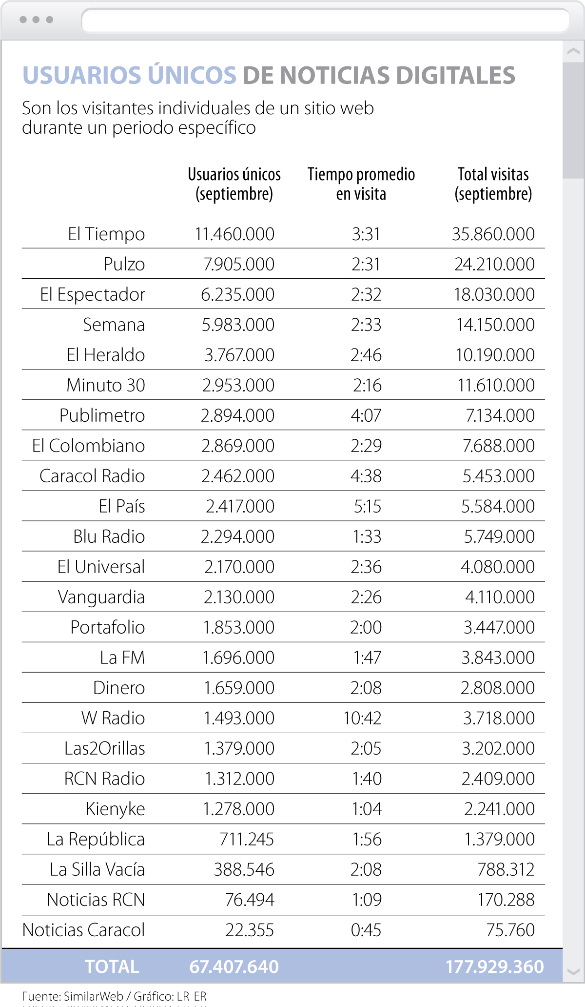 Este nativo digital, cuyo tiempo promedio de visita es de 2 minutos 16 segundos, reportó 2,95 millones de usuarios únicos y más de 11,6 millones de visitas en septiembre; mientras que Publimetro alcanzó 2,89 millones de usuarios únicos y 7,13 millones de visitas, estadísticas que para El Colombiano fueron de 2,86 millones de usuarios y 7,68 millones de visitas.