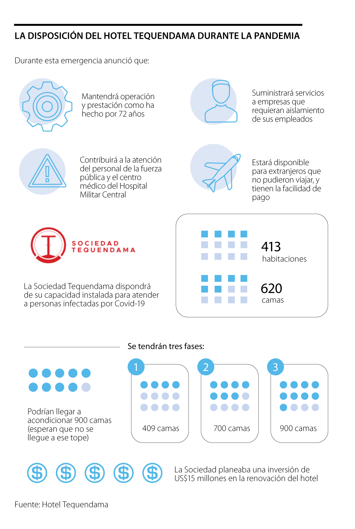 El vicealmirante es consciente de los números en rojo que arrojará el sector al finalizar el año, por lo que dio a conocer que las instalaciones del Hotel Tequendama en Bogotá se pusieron a total disposición para atender a miembros de la fuerza pública y del centro médico del Hospital Militar Central que requieran estar en aislamiento.