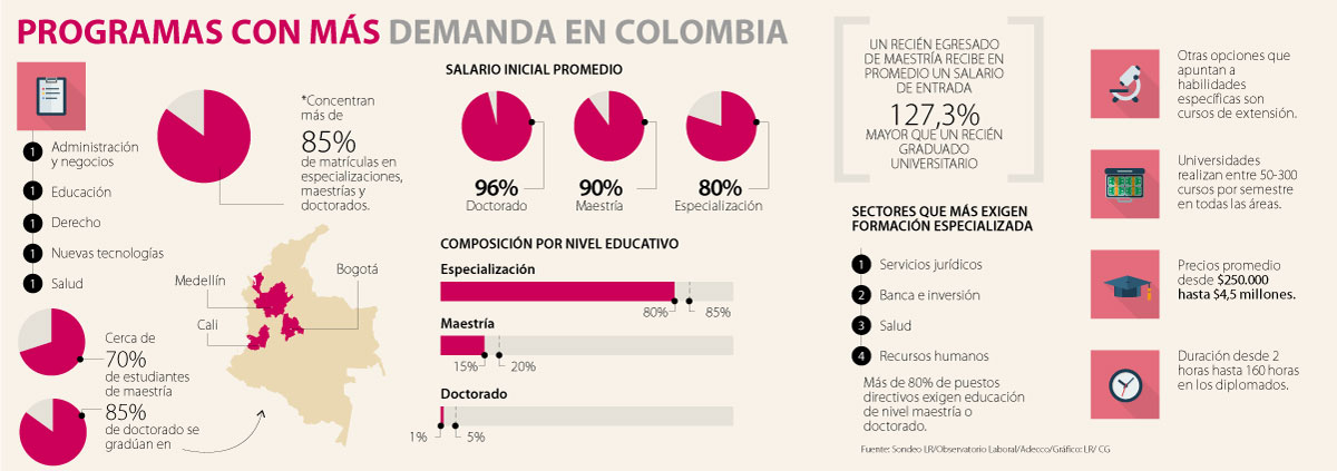 De acuerdo con datos de la cartera educativa en Colombia, un recién egresado de maestría recibe en promedio un salario de entrada 127,3% mayor que un recién graduado universitario, “lo que evidencia sus inmediatas ventajas en ingreso monetario. Por tanto, se recomienda no esperar mucho tiempo entre lo que se acaba una carrera de pregrado y lo que se inicia uno más avanzado”, agregó la experta sobre su proyección.