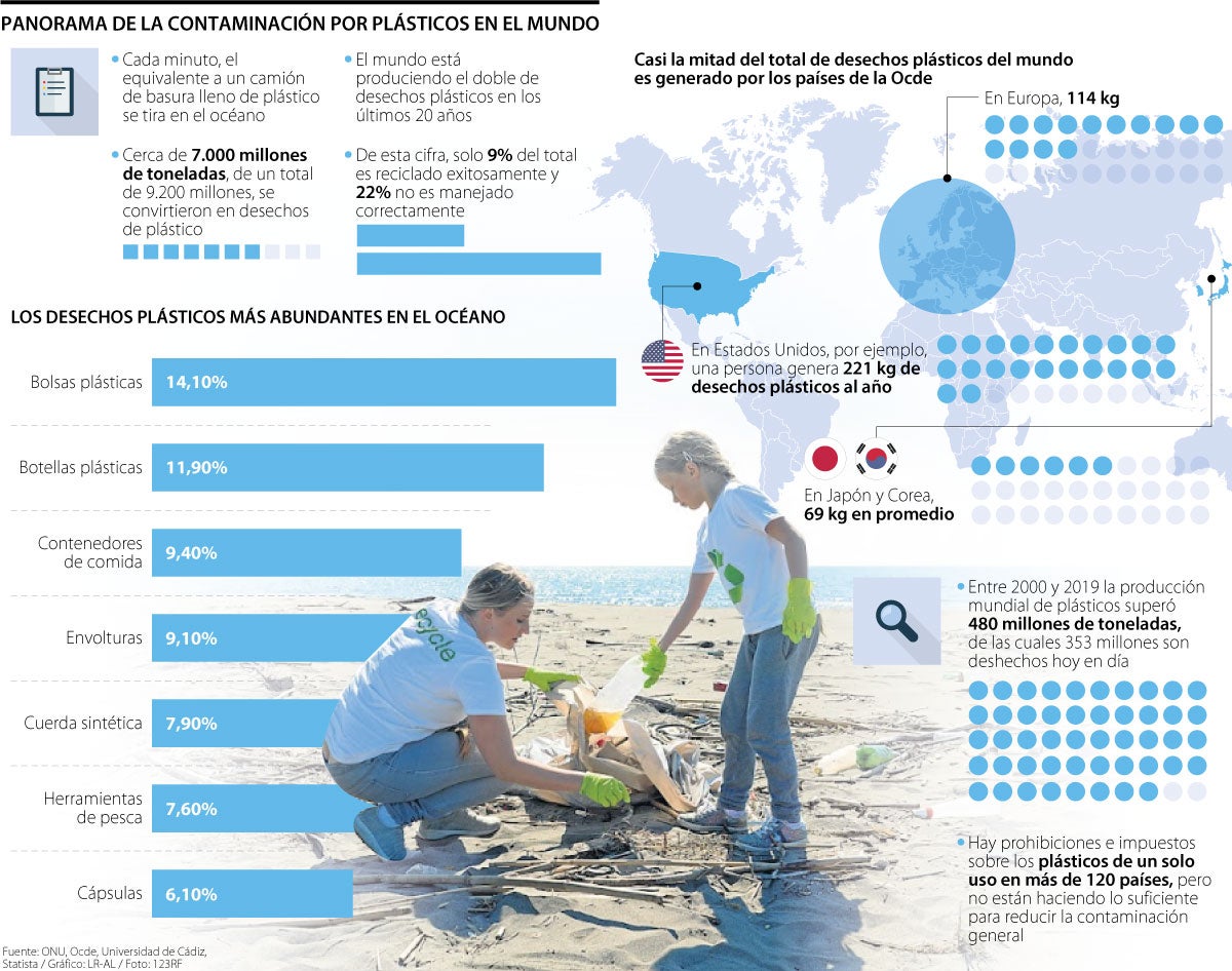 Los países de la Ocde generan la mitad de los deshechos plásticos del mundo. En Estados Unidos, por ejemplo, una persona en promedio genera 221 kg al año, mientras que en Europa 114 kg y 69 kg, en promedio, para Japón y Corea del Sur.