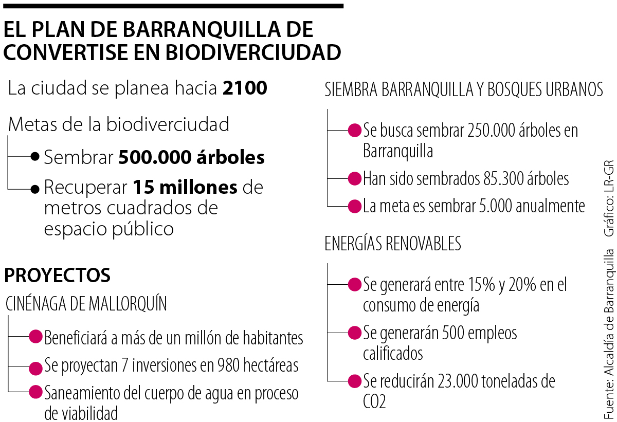 Según la Alcaldía de Barranquilla convertir a la capital del Atlántico en biodiverciudad conllevará sembrar y mantener 500.000 árboles, recuperar 15 millones de metros cuadrados de espacio público y entregar 26.000 hectáreas.