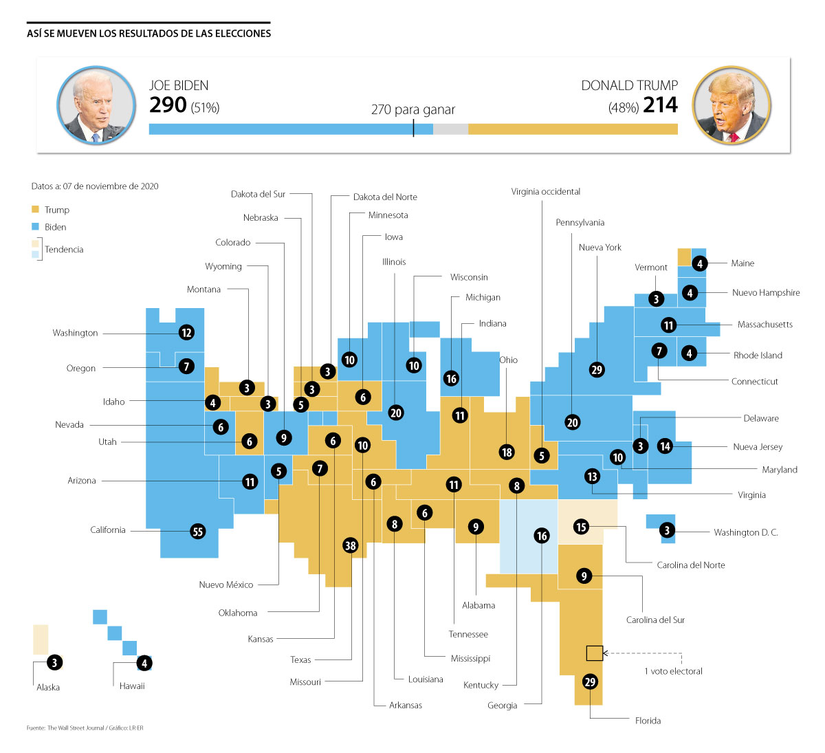 Biden sumó 290 votos electorales para llegar a la Presidencia. Este se impuso en estados como Michigan, Wisconsin, California o Nuevo México, sin embargo, el estado clave fue Pensilvania, que en la mañana del sábado le sumó 20 votos electorales. Minutos después también se quedó con los 6 votos de Nevada.