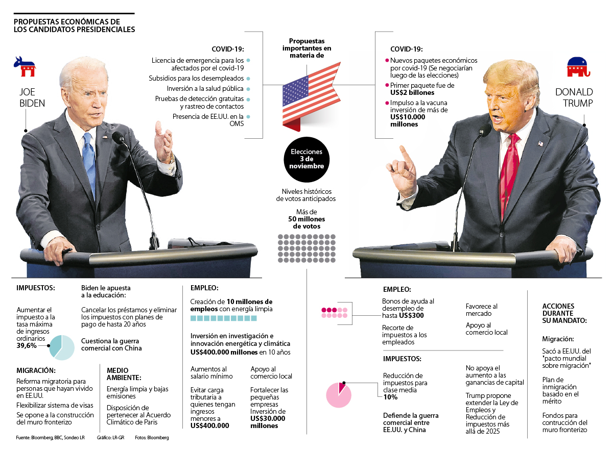 Las propuestas para la reactivación económica pospandemia de cada candidato fueron enfocadas por una línea muy similar a la del empleo: Trump se centró en continuar con las políticas que ha implementado estos últimos años con impuestos más bajos y un apoyo a la industria petrolera.