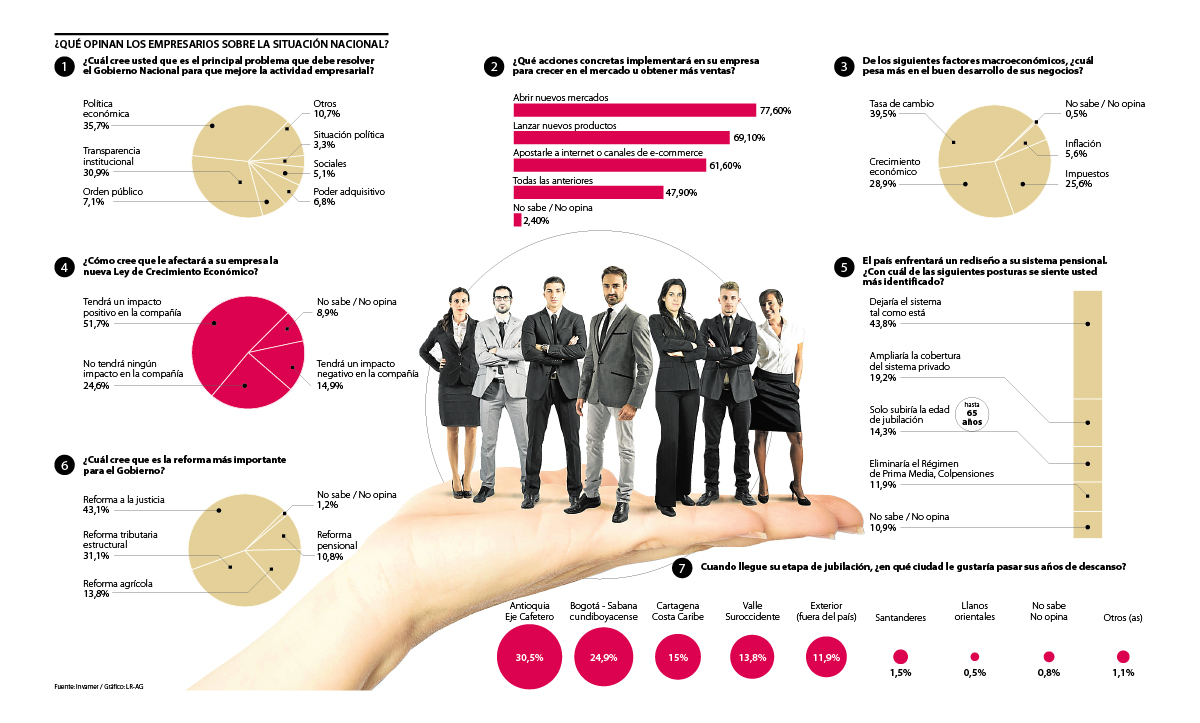 A la pregunta: ¿Cuál cree que es la reforma más importante para el Gobierno Nacional? Del total de los encuestados, 43,1% dijo que la reforma a la justicia debe ser la másLey de Crecimiento Económico tendrá un efecto positivo en las empresas importante para la actual gestión presidencial. De segundo, está la reforma tributaria estructural, con una preferencia de 31,1%. La reforma agrícola ocupa el tercer lugar, con 13,8%; y de cuarto lugar está la reforma pensional, con 10,8%. Aunque en el listado no se menciona la reforma laboral, sí fue uno de los temas más comentados por los empresarios consultados.