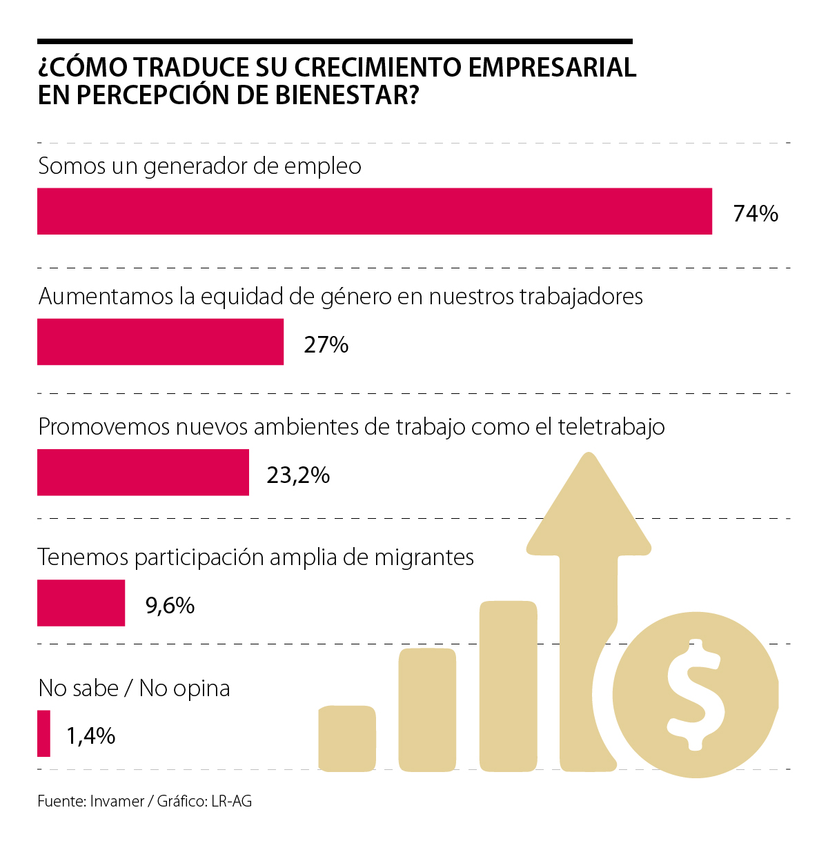 En este sentido, en la encuesta que se hace con Invamer a más de 200 empresarios, se realiza la pregunta: ¿Cómo traduce su crecimiento empresarial en percepción de bienestar? Para que sean ellos mismos los que digan cómo consideran su aporte a la sociedad. Del total del encuestados, 74% indicó que son un generador de empleo.