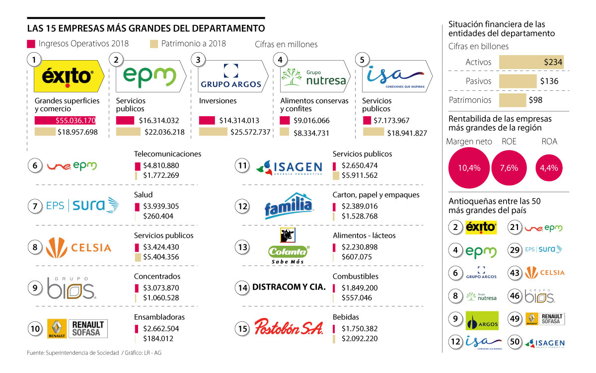 Almacenes Éxito es el líder de la lista con ingresos a 2018 superiores a $55 billones; en el segundo lugar está la empresa de servicios públicos EPM cuyos ingresos sumaron $16,3 billones; mientras que Grupo Argos, tercera en el ranking, registra poco más de los $14,3 billones. Por otra parte, en los puestos cuatro y cinco están Grupo Nutresa e ISA con $9 billones y $7 billones respectivamente en ingresos operativos.