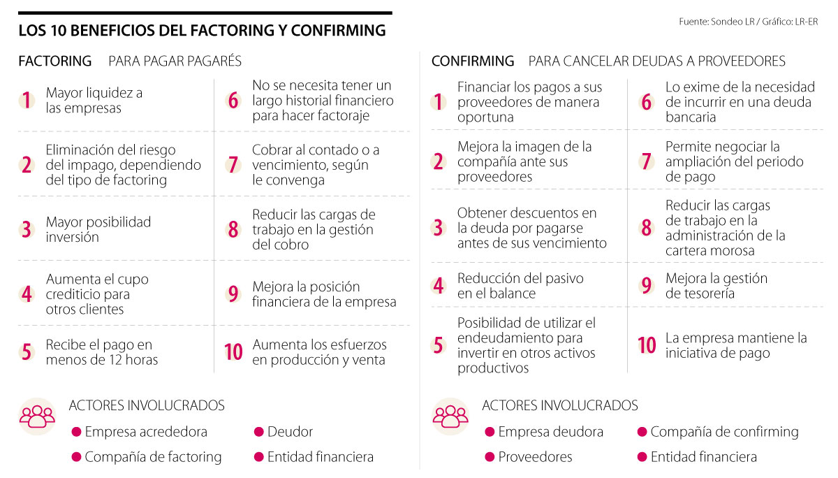 “La empresa de confirming contratada se encargará de hacer los pagos en los tiempos establecidos por La Ley de Pagos Justos. Con esto, el cliente de este recurso financiero logra aumentar sus plazos de cartera y seguir con caja”, dijo Macías.