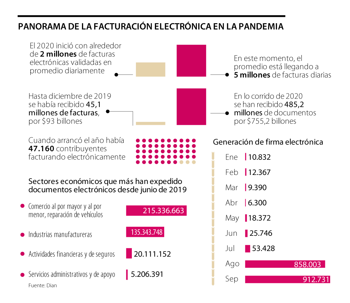 En cuanto a la generación de firma electrónica, la Dian dio a conocer que en marzo, mes en el que inició la crisis sanitaria, se generaron 9.390; sin embargo, la cifra fue incrementando, en mayo se generaron 18.372 firmas electrónicas, en junio 25.746, en julio 53.428, en agosto 858.003 y en septiembre la generación de firmas electrónicas llegó a 912.731.