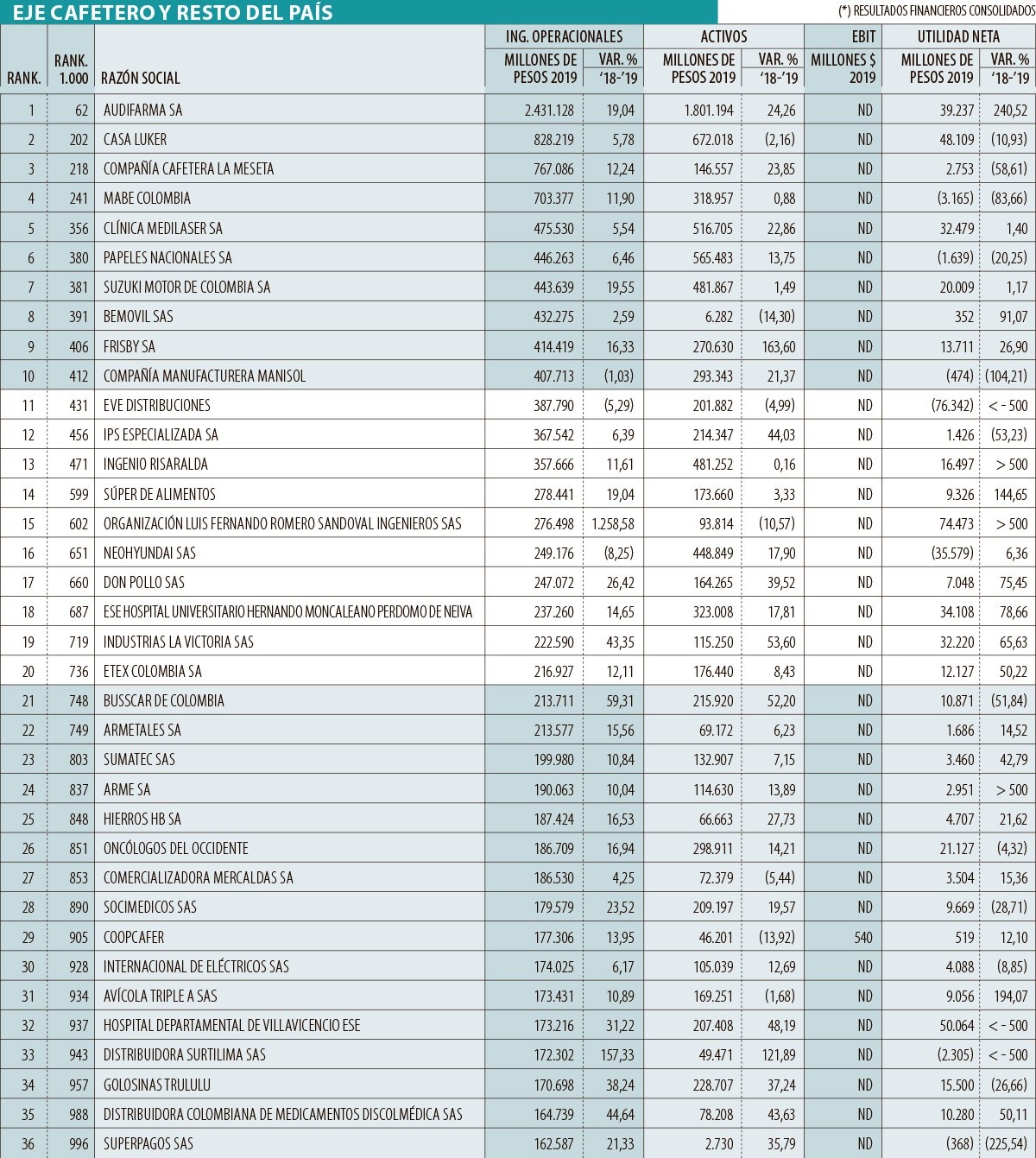 Dentro de estas 36 compañías también se resalta la presencia de Papeles Nacionales, Suzuki, Bemovil, Frisby, Ingenio Risaralda, Súper de Alimentos, Don Pollo, Armetales, Golosinas Trululú y Superpagos, entre otras. Sin duda, estas regiones significan una parte importante de la economía colombiana.