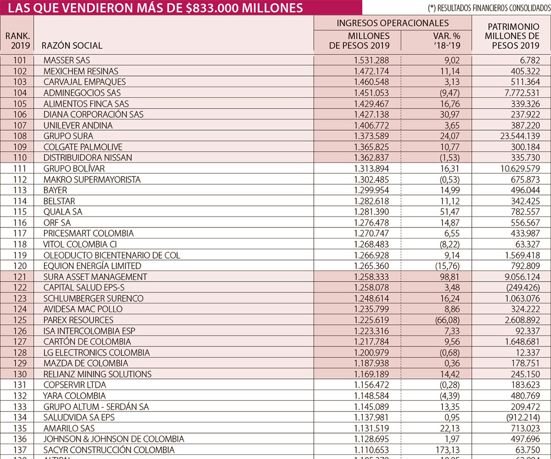 De acuerdo con el informe entregado por la Superintendencia de Sociedades, el segundo grupo, que comprende a las compañías de la 101 a la 200 que más vendieron en Colombia, fue liderado al igual que en 2018 por Masser S.A.S., la cual obtuvo ingresos por $1,5 billones. El segundo lugar lo ocupó Mexichem Resinas, al registrar ingresos por $1,47 billones; y el tercer puesto fue para Carvajal Empaques, que ingresó $1,46 billones. En la cuarta y quinta posición se ubicaron la sociedad por acciones simplificada Adminegocios S.A.S. ($1,45 billones) y Alimentos Finca S.A.S., compañía dedicada a la producción y distribución de alimentos concentrados para animales ($1,42 billones).