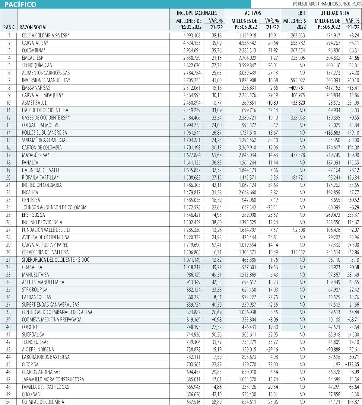 Luego de Celsia, siguió Carvajal S.A., que alcanzó $4,8 billones en ventas para 2022. La compañía cerró el año con números verdes y registró un incremento de 35% en su facturación frente a 2021. En el tercer lugar de la región estuvo Colombina, que registró $2,9 billones en ventas, además de un fuerte impulso al pasar del puesto nueve al tercero.