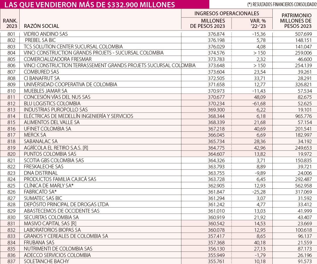 En el informe de Las Mil Más Grandes, el club que abarca de la empresa 801 a la 900 tuvo ingresos por más de $35,23 billones durante 2023 y utilidades por $1,02 billones. Para formar parte de este grupo, una compañía tuvo que vender $322.900 millones durante el año pasado, cifra que registró Inversiones Eldorado, la última de este listado.