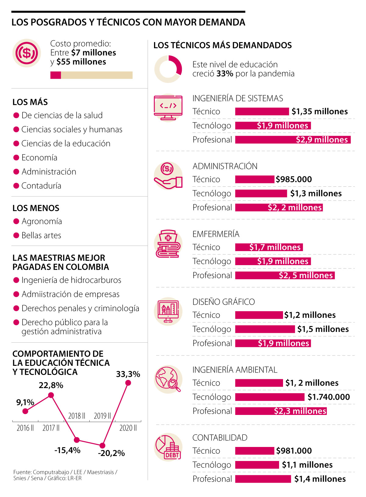 Según el Laboratorio de Economía de la Educación, LEE, de la Universidad Javeriana, mientras que por la pandemia la matrícula de pregrados en Instituciones de Educación Superior (IES) privadas cayó 23% en el segundo semestre de 2020, con respecto al mismo semestre de 2019; por su parte, al analizar la matrícula a primer curso en instituciones públicas de formación Técnica y Tecnológica, esta creció 33% en el mismo periodo analizado, respecto a 2019.
