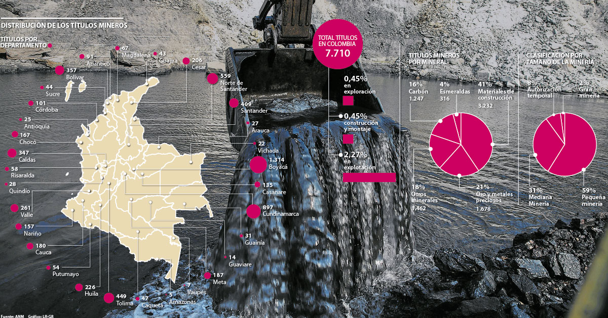 La Agencia Nacional de Minería (ANM) acaba de entregar un reporte que deja ver cómo va el sector en Colombia teniendo en cuenta los títulos entregados. Lo primero que resalta es que actualmente, solo 3,2% del territorio es lo que está titulado por parte de la ANM con (6.490 títulos), y 1.220 más de la Gobernación de Antioquia; esto equivale a 2,7 millones de hectáreas formalizadas.