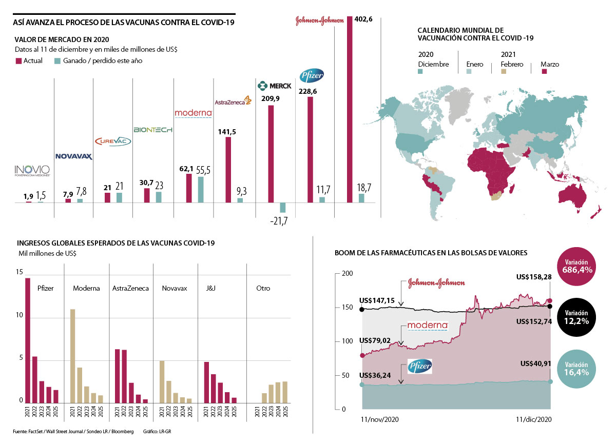 Más allá de las características que tienen cada una de las vacunas que están o llegarán al mercado, las acciones de las farmacéuticas que lideran la carrera han registrado ganancias que llegan hasta 686,4%, como es el caso de Moderna, ya que sus acciones pasaron de US$18,64 en diciembre de 2019 a US$158,62 a la misma fecha para este año.
