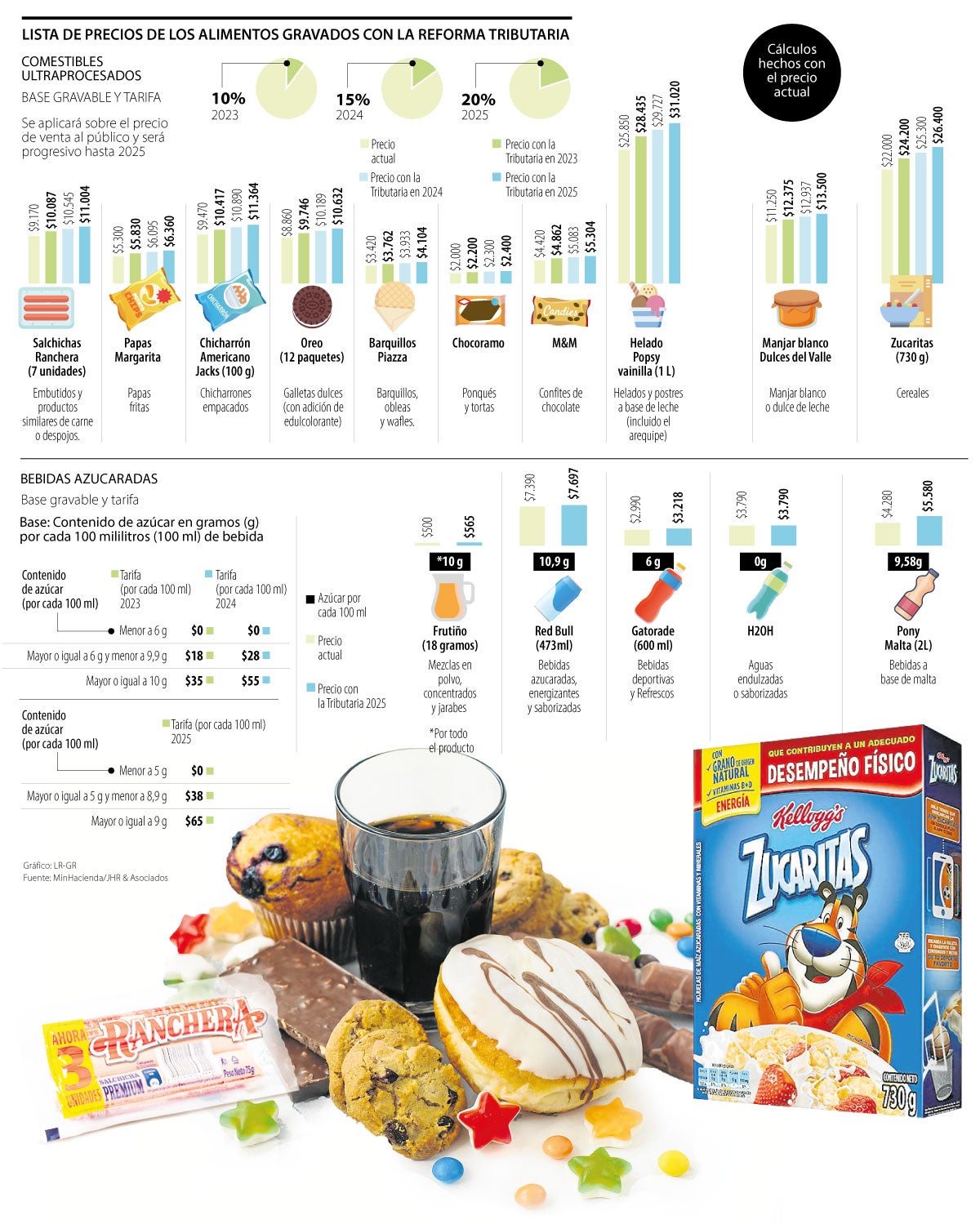Para las bebidas azucaradas entre 2023 y 2024, las bebidas como gaseosas, yogures, jugos de fruta y maltas que tengan entre seis gramos y 9,9 gramos de azúcar por cada 100 ml, pagarán respectivamente $18 y $28 de más por cada 100 ml. Los líquidos con una concentración mayor a 10 gramos por cada 100 ml, pagarán $35 en 2023 por cada 100 ml y $55 por la misma cantidad en 2024.