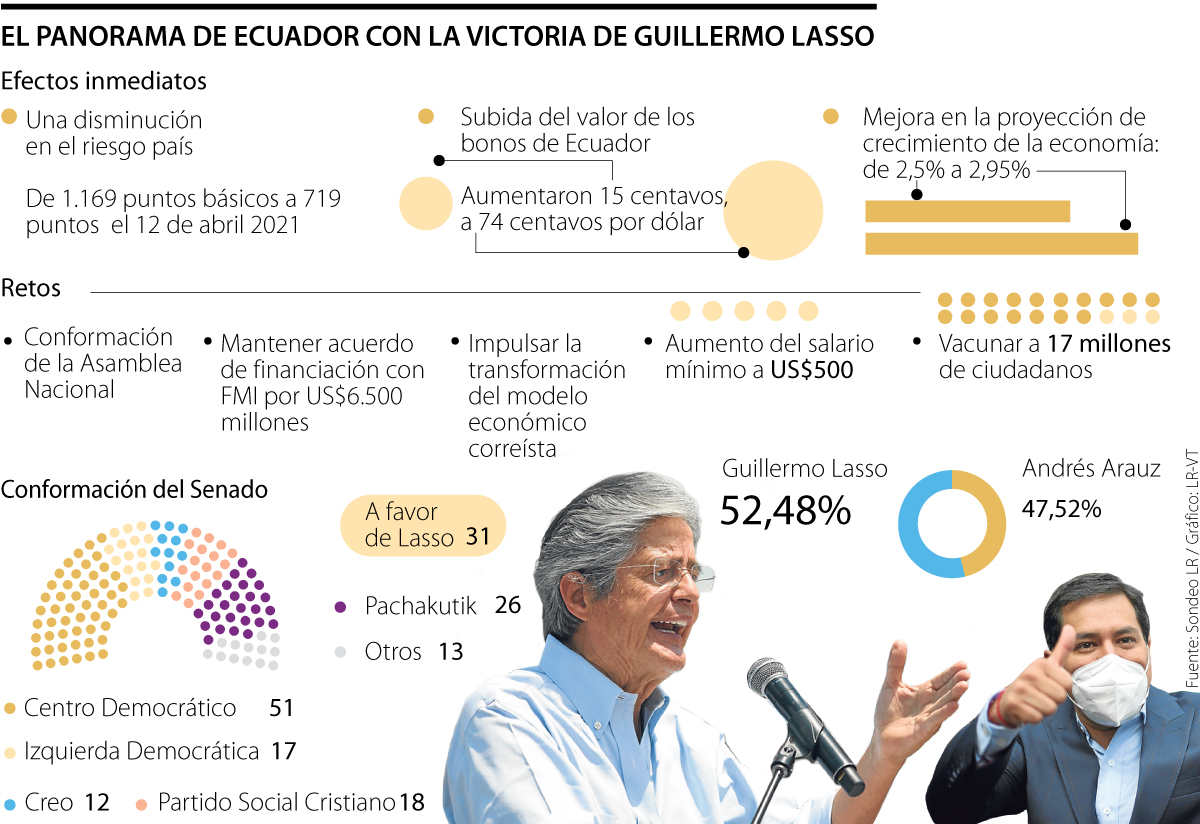 Solo 24 horas después de que el conservador y ex banquero Guillermo Lasso derrotara en las urnas a Andrés Arauz, cuota del correísmo, con un porcentaje de 52,48% contra 47,52% de los votos, el riesgo país de Ecuador bajó desde 1.169 puntos básicos a 719, lo que significó un recorte de 450 puntos y una señal del aumento de la confianza del mercado sobre el nuevo gobierno de Ecuador.