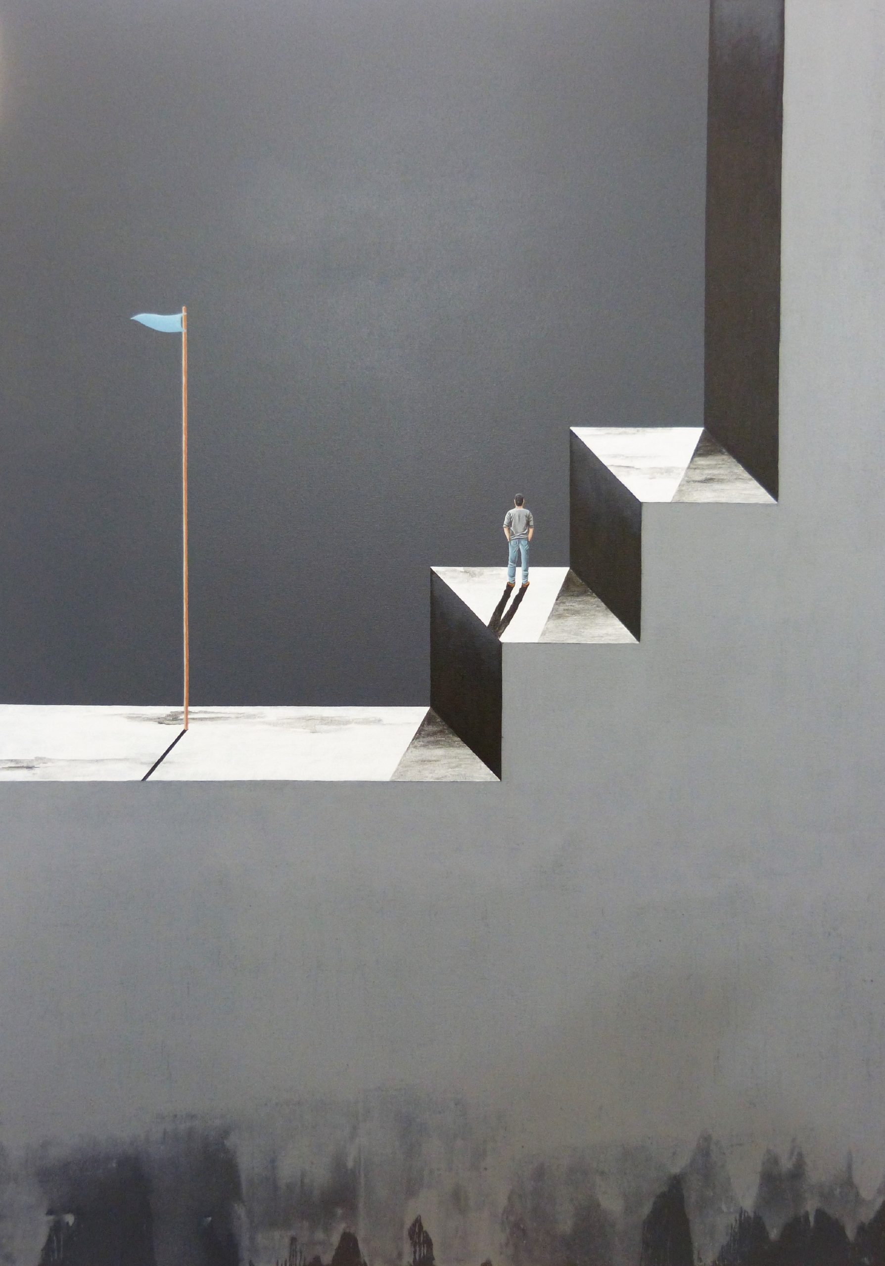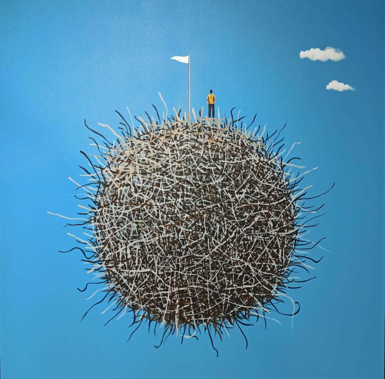 Este acrílico hace parte de la serie ‘Arquitectura del silencio’, 2018. Símbolos como casas, árboles secos, nubes, pájaros, barcas, brújulas, mapas, son recurrentes en sus pinturas y dibujos por la necesidad de construir metáforas a partir de la recopilación de imágenes. En 2015 hizo parte de ‘Latin American Art In Newquay’.