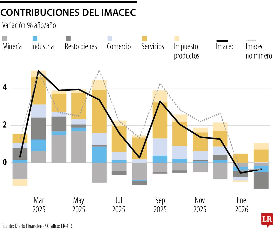 El Índice Mensual de Actividad Económica cayó 0,3% en febrero comparado con el mismo mes del año pasado, mientras los analistas esperaban un crecimiento en el segundo mes de 2026