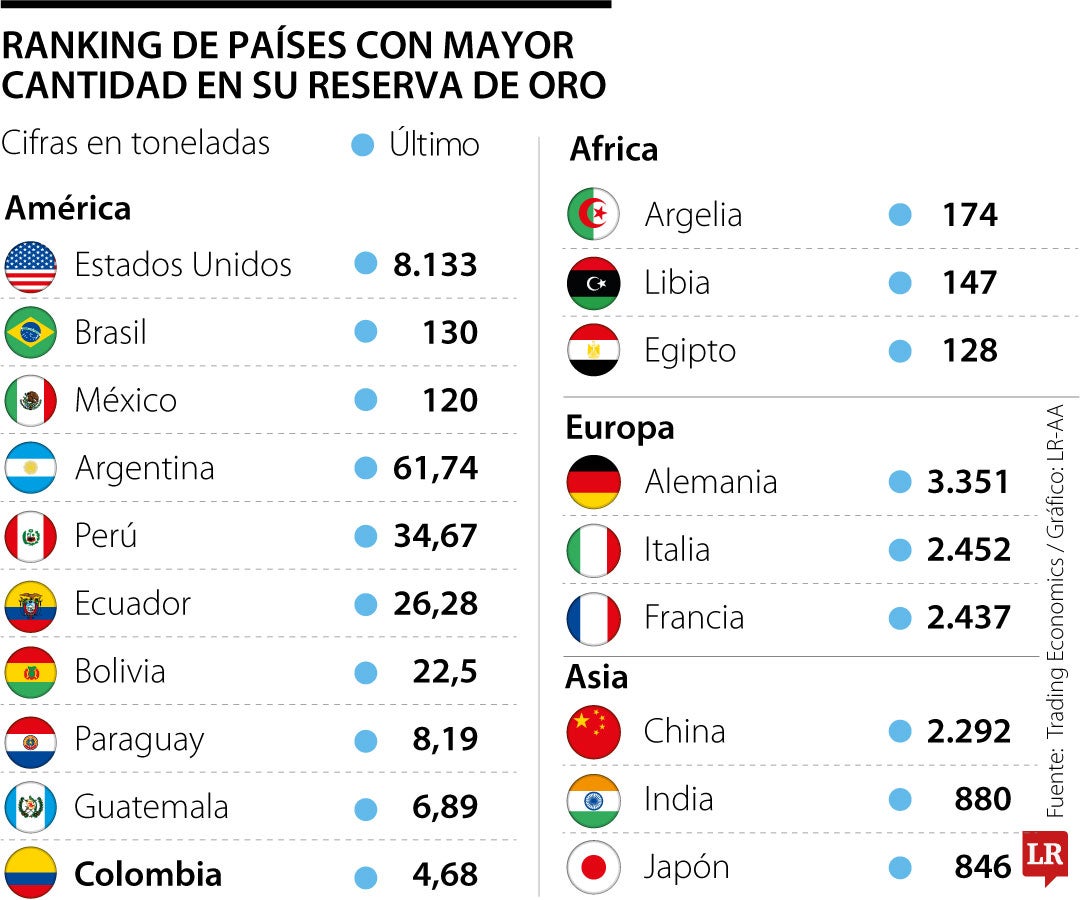 EE.UU. lidera las reservas de oro con 8.133 toneladas, seguido de Alemania e Italia; mientras que Colombia ocupa el décimo lugar en América