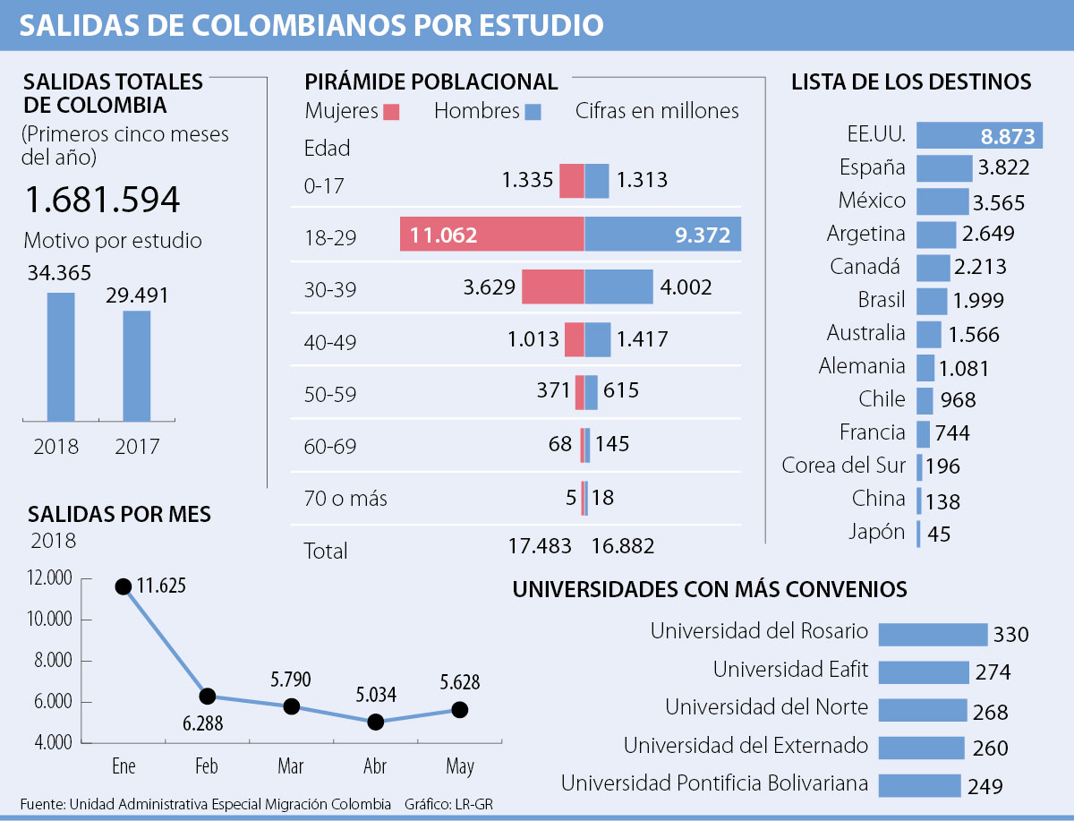 Para que la educación superior en Colombia sea más competitiva con el resto del mundo es necesario que las entidades educativas de todos los niveles diversifiquen sus programas de internacionalización. Tanto instituciones del Estado como privadas deben crear convenios con los países potencia. De acuerdo con la base de datos de flujos de salida de colombianos de Migración Colombia, a corte de mayo, 34.365 personas salieron del país por motivos de estudio. En 2017 fueron 29.491 en el mismo periodo.