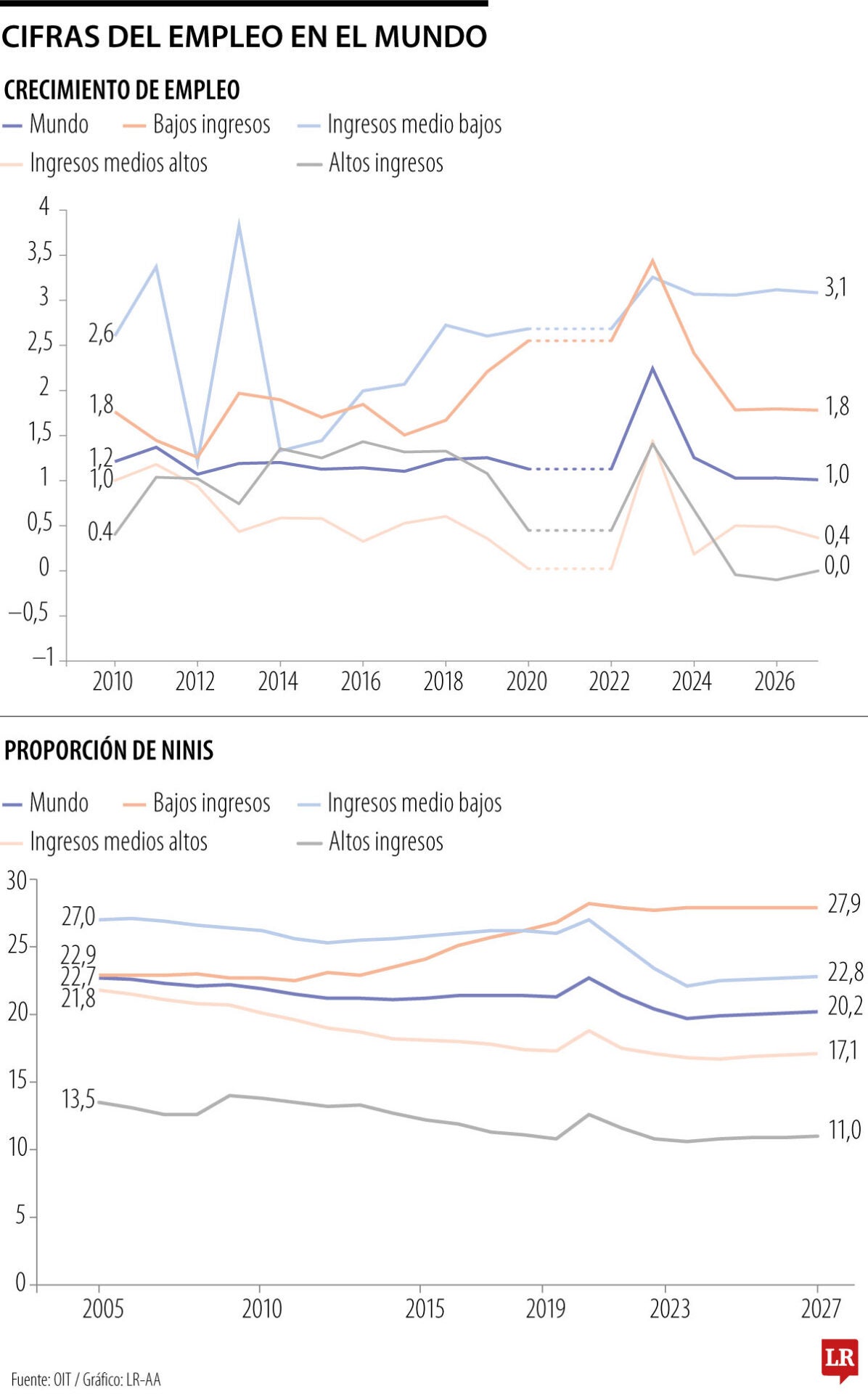 "Gracias al fuerte crecimiento demográfico y a la gran cohorte de jóvenes que se incorporan al mercado laboral, se prevé que el empleo en los países de bajos ingresos crezca un 3,1 % en 2026, tras una tasa de crecimiento medio del 2,3 % entre 2010 y 2019. Sin embargo, el débil crecimiento de la productividad y la escasez de oportunidades de trabajo digno pueden impedir que estos países aprovechen el potencial dividendo demográfico", agregó la organización.