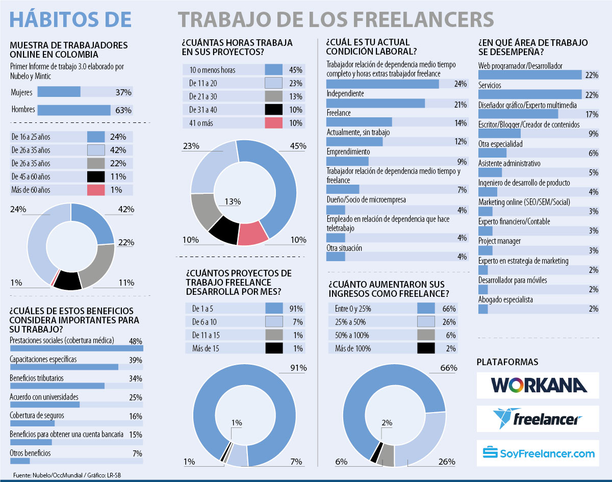 En Colombia, se estima que al menos 45% de las personas que cotizan a seguridad social, lo hacen como trabajadores independientes, es decir, que ejercen su propia actividad de manera autónoma. Sin embargo, más allá de los estudios de las propias plataformas de enlace freelance no hay cifras certeras de cuántos de ellos son realmente sus propios jefes.