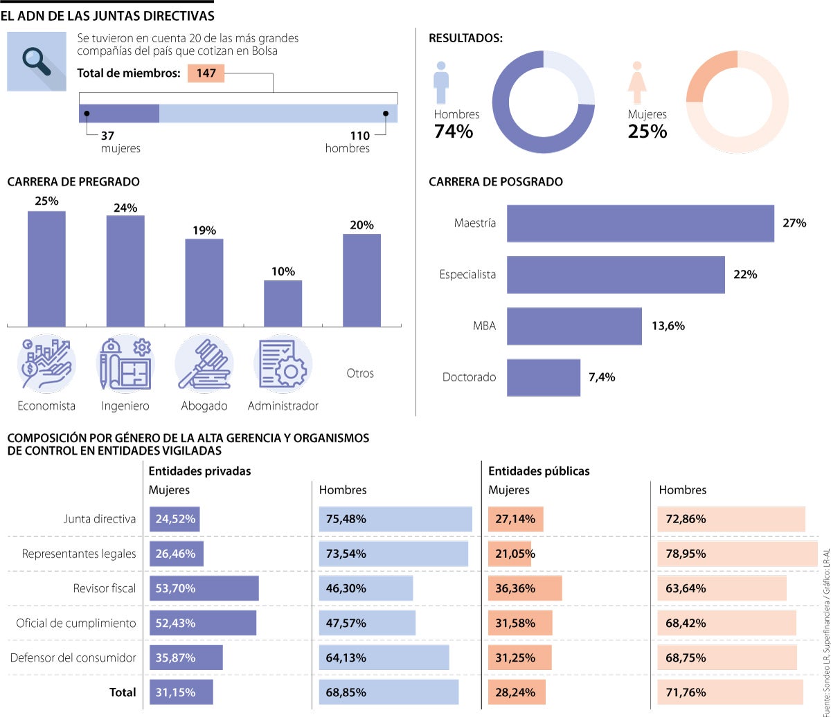 Ya casi termina el cuarto mes del año y con él quedan consolidadas las juntas directivas de las grandes empresas del país, pero ¿cómo están configuradas? LR analizó la composición de las compañías listadas en la Bolsa de Valores de Colombia (BVC), que cuentan con la mayor liquidez en cuanto a negociación y teniendo en cuenta su profesión base, el nivel de estudios de sus miembros y su sexo. El resultado es que el ADN es un hombre, economista, que cuenta con maestría, con una preferencia por estudiar en universidades como Los Andes o el Externado.