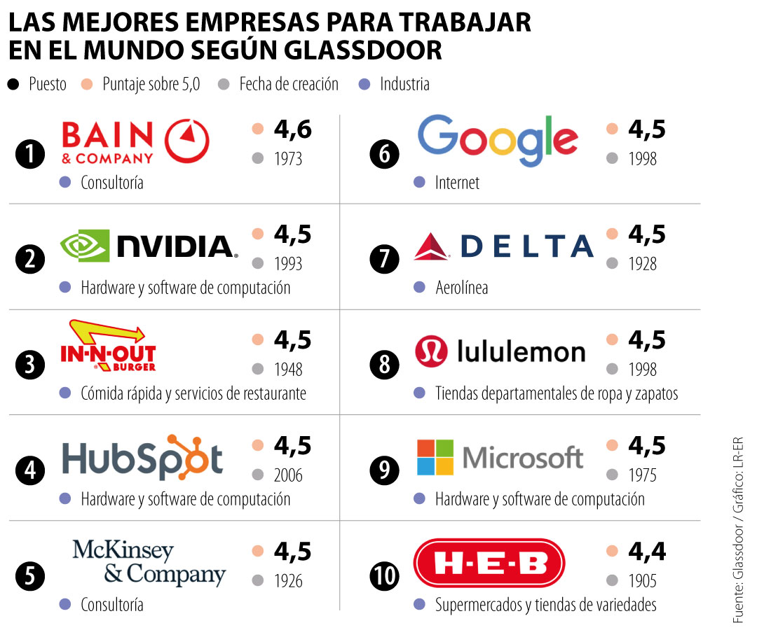 En el top cinco le siguen Nvidia (hardware y software de computación), In-N-Out Burger (comida rápida y servicios de restaurante), HubSpot (hardware y software de computación) y McKinsey & Company (consultoría), todas con calificación de 4,5. Cierran el top diez Google, Delta Air Lines, lululemon, Microsoft y H E B.