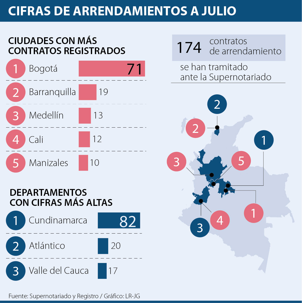 El estudio, además, señala que los departamentos donde se registraron las cifras más altas fueron Cundinamarca (incluida la capital), con 82 contratos de arrendamiento; seguido del departamento de Atlántico con 20 registros y Valle del Cauca con 17 trámites.