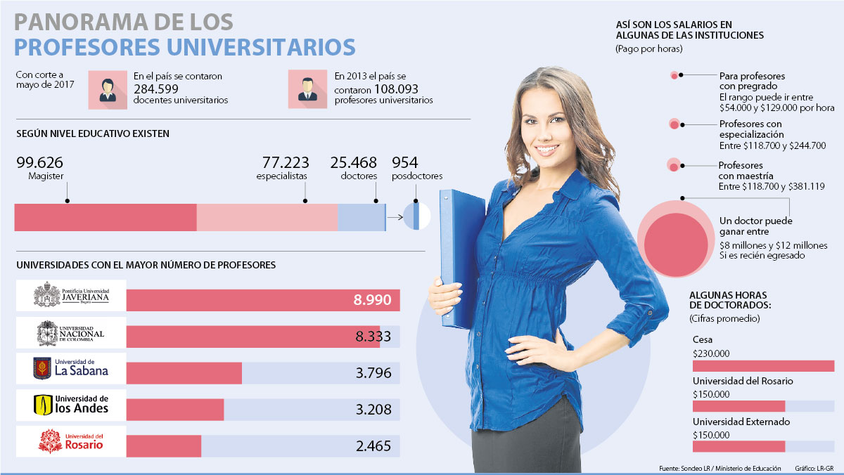 Una de las horas más baratas para los doctores, según destacó el profesor Guillermo Sinisterra, es la de la Universidad Javeriana, ya que la remuneración neta por hora es cercana a los $89.000, mientras que en otras universidades como el Externado un doctor puede ganar $150.000 por hora, al igual que en el Rosario, mientras que en el Cesa, la hora puede valer $230.000. Siendo así, un doctor recién graduado puede ubicar sus ingresos mensuales entre $8 millones y $11,5 millones, siendo la Universidad de Los Andes una de las instituciones con mejor panorama para los 25.468 profesores que tienen este nivel.