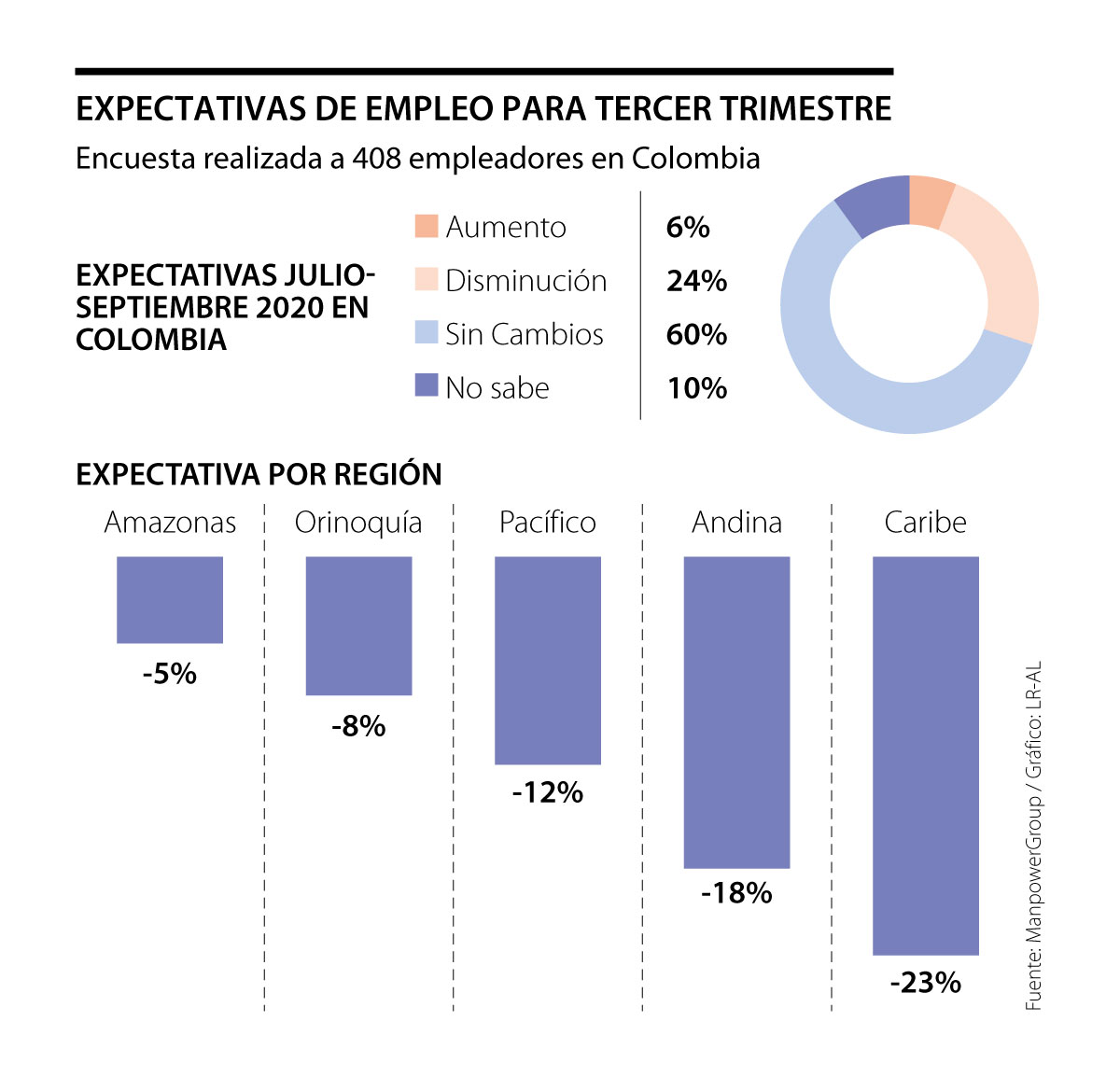 De acuerdo con la encuesta de Expectativa de Empleo para el tercer trimestre de 2020 que realizó ManpowerGroup con 408 empleadores en Colombia, 24% de las compañías proyectan que las contrataciones disminuirán entre julio y septiembre de este año. Así mismo, las expectativas se mantienen constantes para 60% de las compañías, que consideran que no habrá cambios en su nómina, mientras que solamente 6% de las empresas proyecta aumentos. Al mirar por regiones, en todas se percibe una menor intención de contratar.