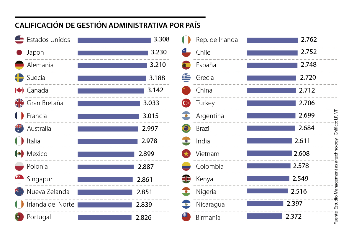 Según el indice de calificaciones de administrativos, el puntaje del país es de 2,578 ubicandolo al final de la lista, con una tarea pendiente