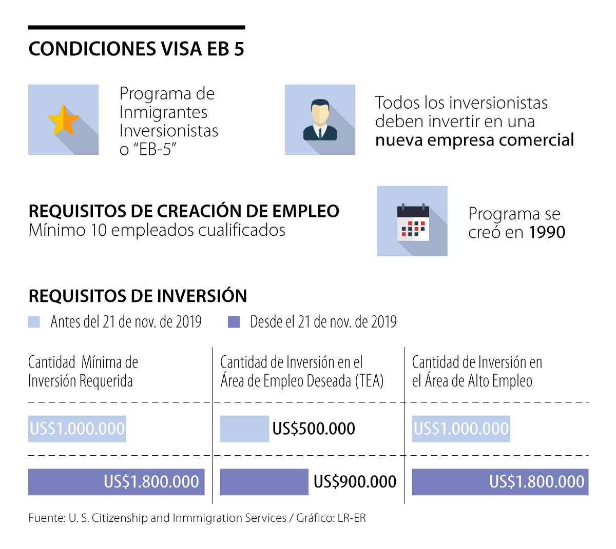 La cantidad mínima estaba en US$1 millón, pero para quienes presenten su petición a partir del 21 de noviembre se elevará a US$1,8 millones. En las áreas de empleo específica (TEA), áreas rurales o con tasas altas de desempleo, en las que el gobierno estadounidense busca más inversiones, el monto mínimo ya no será de US$500.000, sino de US$900.000.