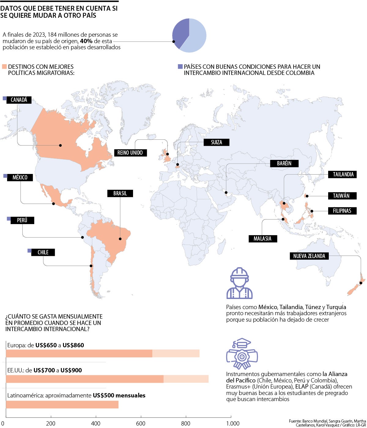 Según la directora, algunos de los beneficios ofrecidos son los instrumentos gubernamentales como la Alianza del Pacífico (Chile, México, Perú y Colombia), Erasmus+ (Unión Europea), Elap (Canadá) que ofrecen muy buenas becas a los estudiantes de pregrado que buscan intercambios. De hecho, Martha Castellanos, experta en el tema, mencionó en un informe de la Organización Internacional para las Migraciones, OIM , que en 2020 se llegaron a registrar cerca de 281 millones de migrantes internacionales en todo el mundo.