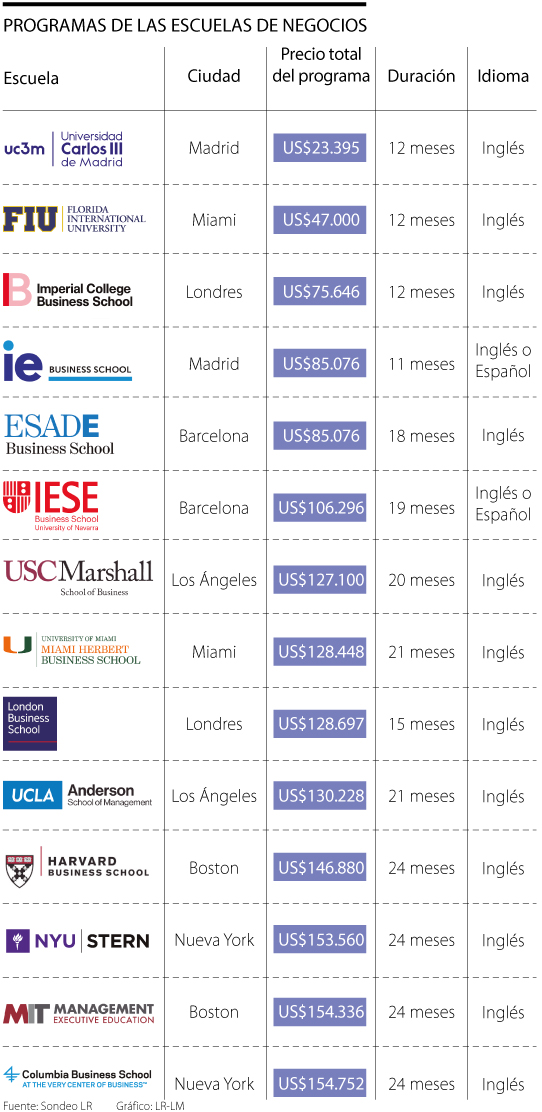 Para ello, se necesita escoger una institución que se adapte al enfoque que se busca y hacer un balance presupuestario de la relación costo-beneficio. Por eso, aquí le presentamos una lista con algunos programas de MBA en universidades de siete ciudades del mundo, que son comúnmente buscadas para cursar estos estudios (ver gráfico).