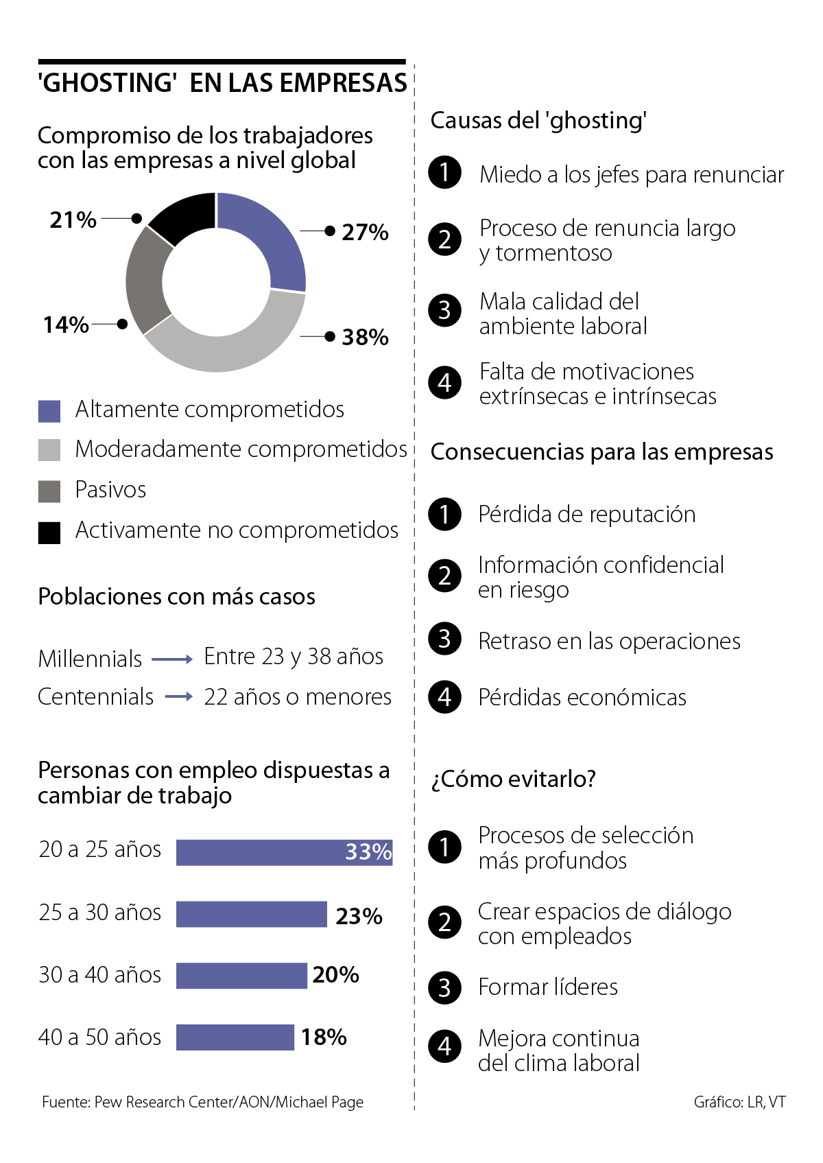 Este comportamiento también podría obedecer al nivel de compromiso de los trabajadores con la empresa, que es el nivel de inversión psicológica del empleado en su organización. Según un estudio de AON, 65% de los trabajadores a nivel mundial está moderada o altamente comprometido con la empresa, es decir, 35% restante es susceptible de caer en está práctica.
