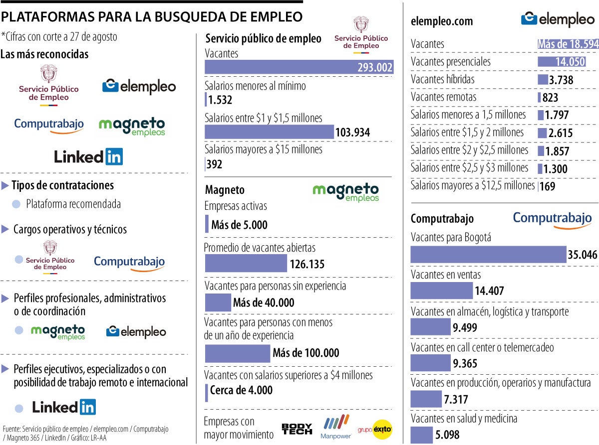Por su parte, Computrabajo cuenta con 35.046 vacantes de empleo solo para Bogotá, de las que 14.407 se enfocan en ventas, 9.499 en almacén, logística y transporte, 9.365 en call center o telemercadeo, 7.317 en producción, operarios y manufactura y 5.098 en el área de la salud y medicina. Una gran parte de las ofertas que están en la plataformas (24.971) están abiertas a personas sin experiencia o con un año de experiencia (30.296). Por otro lado, las zonas que más vacantes disponibles tienen son Antioquia, Valle del Cauca, Cundinamarca y Santander. Esto, con ofertas que ofrecen salarios desde menos de $600.000 y hasta más de $18 millones.
