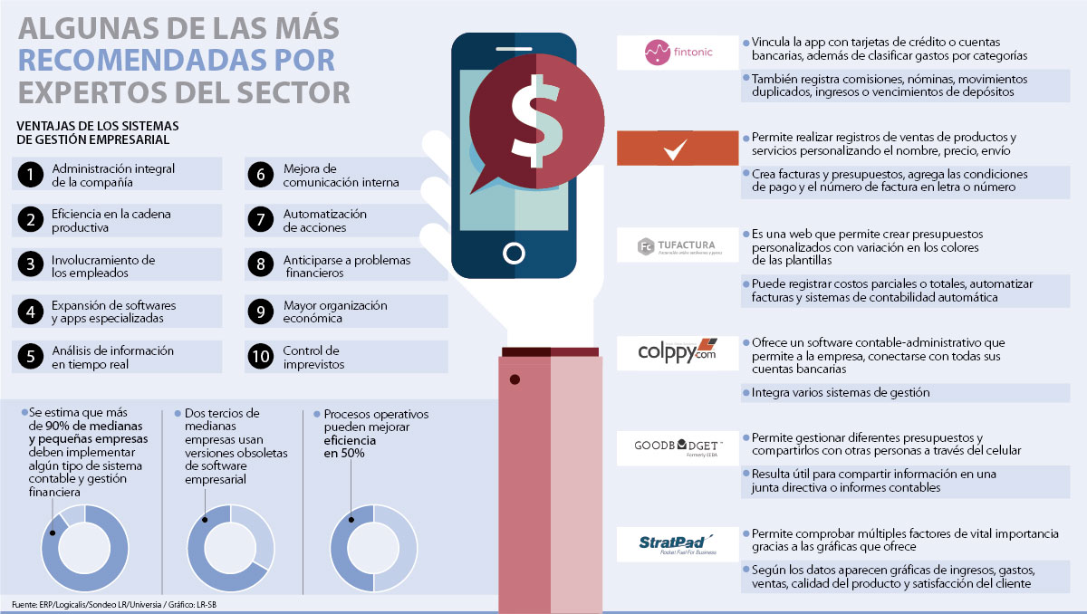 Otra de las ventajas que se pueden obtener a través de los resultados que otorgan apps de organización financiera, según los sistemas de planificación de recursos empresariales, es lograr “una administración integral de la compañía, eficiencia en la cadena productiva, un mayor involucramiento de los empleados, análisis de información en tiempo real, mejora de comunicación interna, automatización de acciones, anticipación a problemas financieros, mayor organización económica y control de imprevistos”, explicó Sara Castillejos, consultora en ERP.