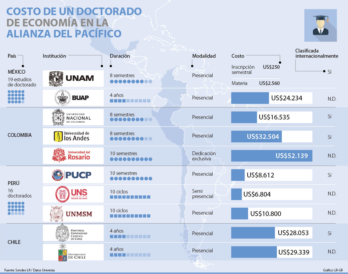En los cuatro países que componen la Alianza del Pacífico, el costo de un doctorado en economía oscila entre US$7.000 y US$52.000. La duración promedio de un estudio de esta clase es de cuatro años, y la gran mayoría de instituciones universitarias, exigen que los estudiantes se matriculen en programas presenciales.