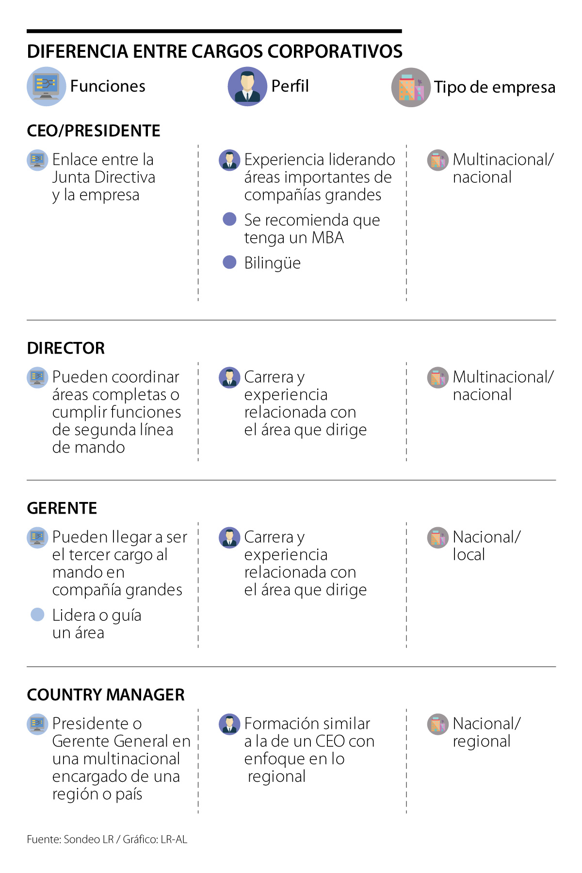 Un CEO, Country Manager o un presidente pueden desempeñar las mismas funciones o incluso considerarse lo mismo. Sin embargo, el alcance de cada uno puede ser diferente según la compañía. En otras palabras, en empresas locales el cargo directivo que se encuentra usualmente es el de presidente o gerente general, mientras el cargo en las multinacionales es el de CEO. En el caso de los Country Manager pueden tener un alcance nacional o mayor, dependiendo si lidera los procesos desde el país más importante para la empresa.