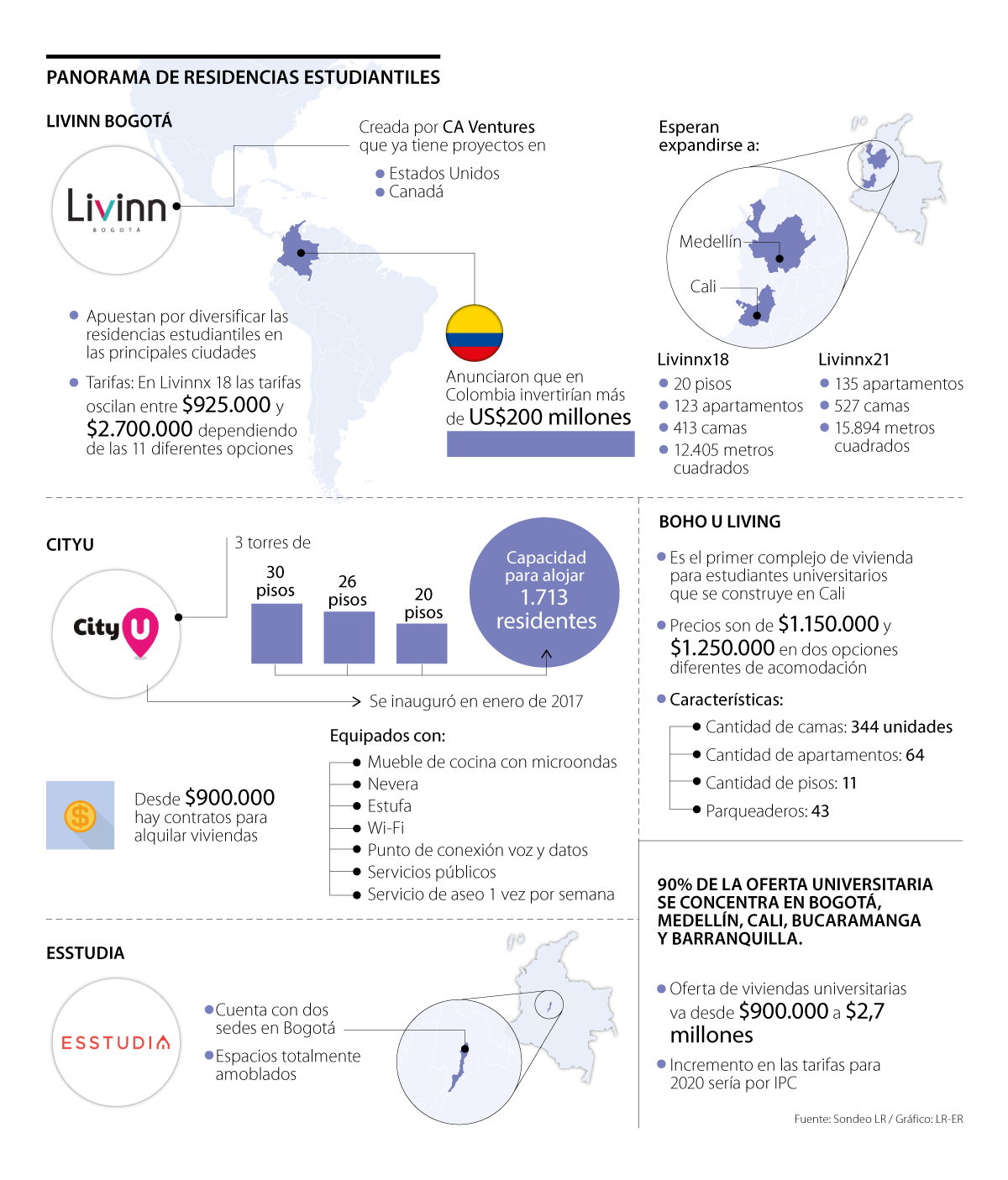 Bogotá es la ciudad donde se concentra el mayor tipo de vivienda universitaria. En la capital del país, por ejemplo, se han consolidado opciones como CityU y Livinn, las cuales ofrecen viviendas con todo tipo de servicios incluidos y a diferentes precios. De hecho, esta última fue desarrollada por CA Ventures. Allí, se ofrecen espacios de diferentes tipos, en Livinnx 18 las tarifas oscilan entre $925.000 y $2,7 millones dependiendo de cuál de las 11 distintas opciones que tienen en acomodación se escoja.