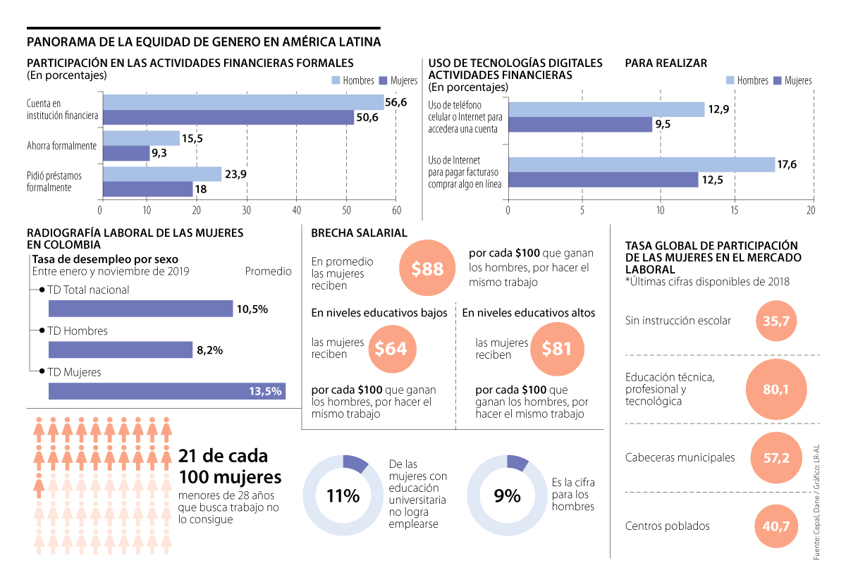 En el documento, de 224 páginas, se evalúan los avances en la inclusión financiera, los salarios, la composición del hogar y la respuesta de los gobiernos frente a la violencia contra la mujer. Aunque de entrada se aclara que se ha avanzado en la coordinación de políticas que permiten cambiar el panorama, se concluye que el débil crecimiento del PIB regional no permite que se consoliden grandes oportunidades para que el género femenino: no solo en ámbito empresarial y directivo, sino también en la vida cotidiana.
