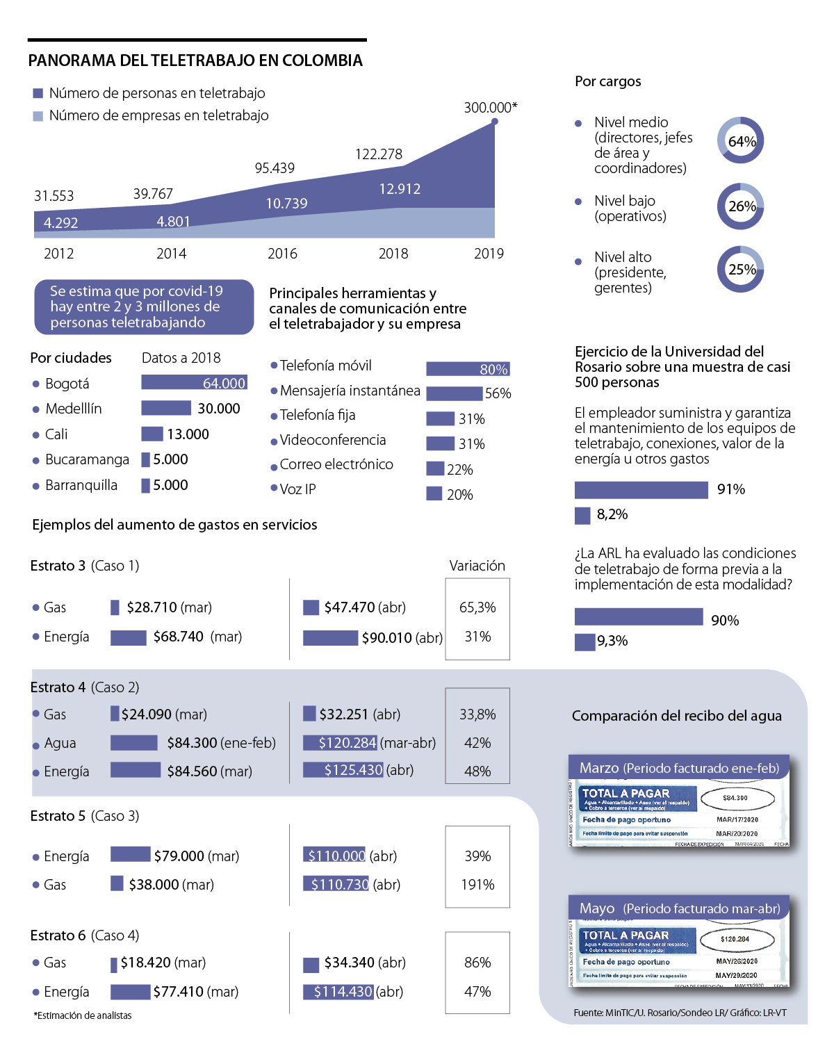 Consultamos a Iván Jaramillo, director del Observatorio Laboral de la Universidad del Rosario, para que nos aclarara este tema, un derecho que aseguró existe, pero que no se aplica. “El teletrabajo regulado en la Ley 1221 de 2008 descansa en tres principios básicos (i) respeto del principio de equidad laboral (ii) inclusión de los teletrabajadores en el programa de salud ocupacional y (iii) reconocimiento del “auxilio de conexión”, por el cual el empleador debe proveer y garantizar el mantenimiento de los equipos de los teletrabajadores, conexiones, programas, valor de la energía, desplazamientos”, precisó.