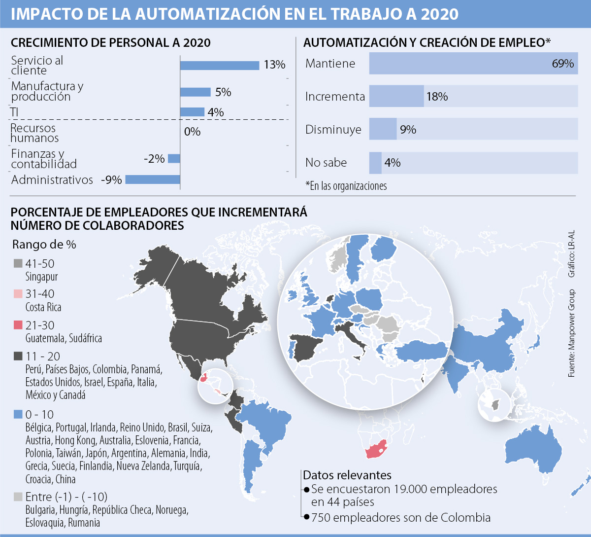 El estudio, que consultó a 19.000 empleadores (750 de Colombia) en 44 países, analizó el impacto de la automatización en el crecimiento del empleo en las organizaciones a 2020, las funciones que más planean aumentar y los tipos de habilidades que más buscan.