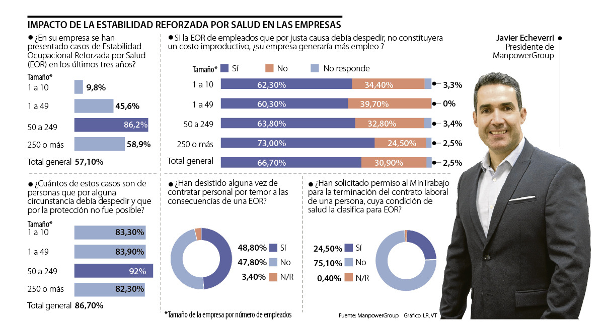 Así lo reveló la encuesta ‘Estabilidad Ocupacional Reforzada por Salud en Colombia’, en la que se determinó que los costos empresariales de estas protecciones a los trabajadores afectan a la generación de entre dos y tres millones de empleos en el país. LR habló con Javier Echeverri, presidente de esta firma de reclutamiento, sobre los hallazgos de esta investigación que se realizó a 408 empresas en todo el país.