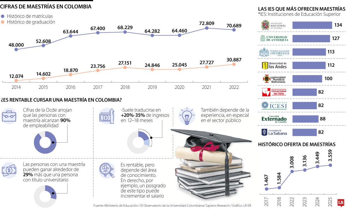 En el caso de Colombia, se ha registrado un aumento en la demanda de maestrías. Entre 2014 y 2024, el histórico de las matrículas creció 56,97%, al pasar de 48.000 a 75.346 alumnos. Asimismo, los graduados de maestrías aumentaron en ese lapso de 12.074 a 39.317, un crecimiento de 225%.
