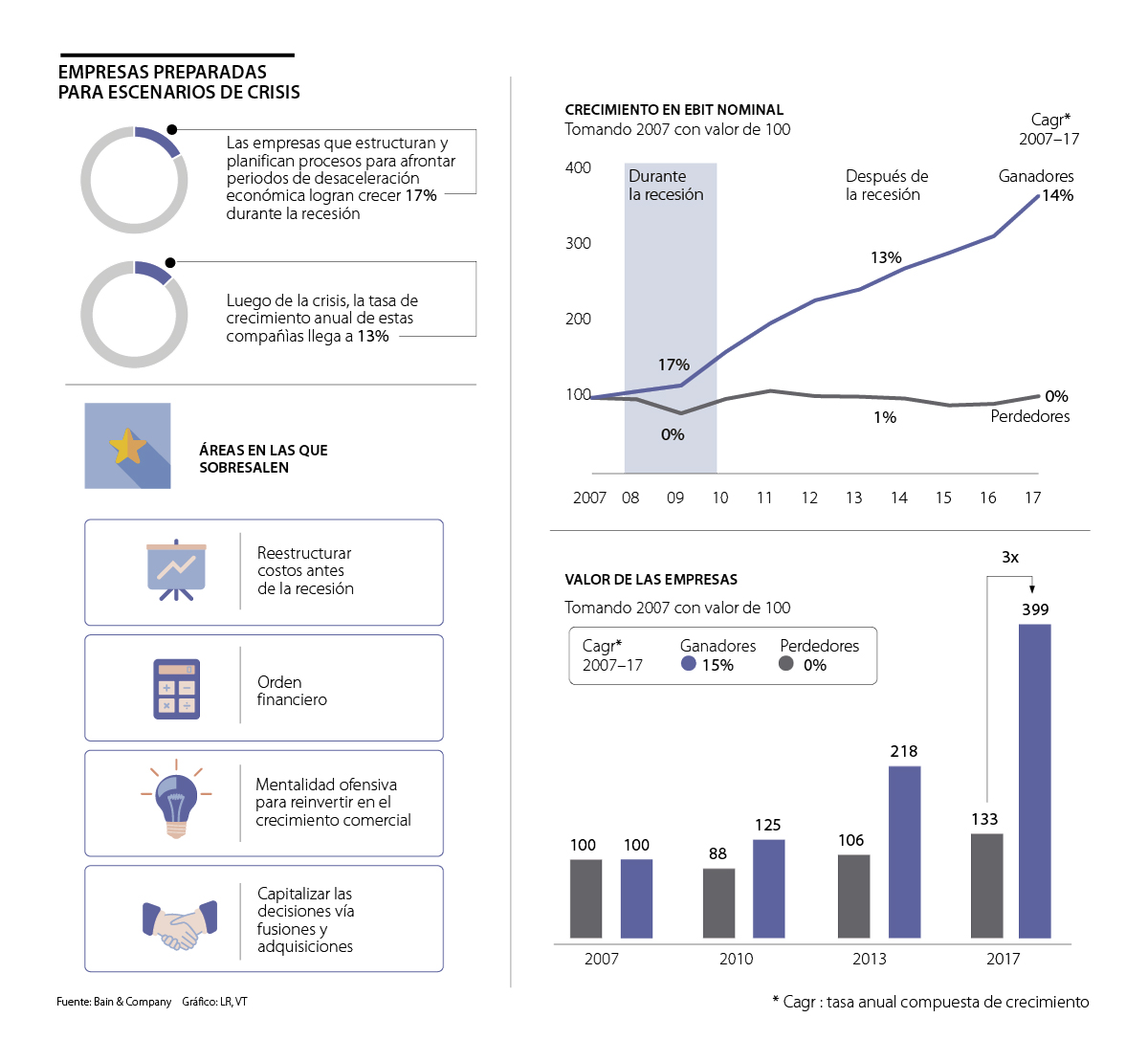 Según cifras de Bain & Company, las empresas que estructuran y planifican procesos para afrontar periodos de desaceleración económica logran alcanzar una tasa de crecimiento anual compuesta de 17% durante la recesión, y una media de crecimiento de 13% en el periodo posterior a la crisis. A su vez, la firma identificó que dichas compañías sobresalen en áreas como la reestructuración de costos, orden financiero y mentalidad ofensiva para reinvertir en el crecimiento comercial.